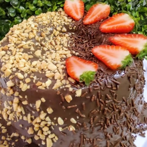 Bolo Vulcão Chocolate Com Mix De Nozes + Morangos Frescos (1,200kg) Serve Até 10 Pessoas