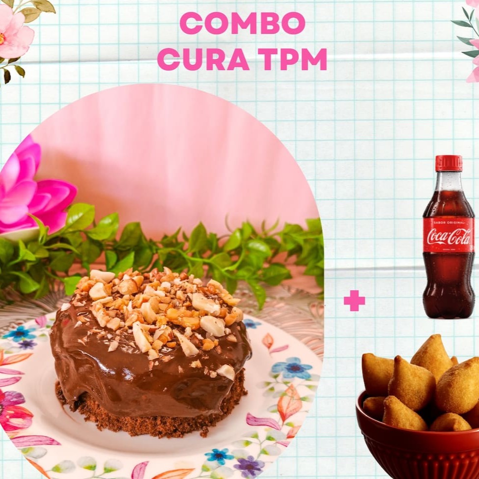 Em dias de Tpm, nada melhor do que um lanche especial para aliviar o estresse, não é mesmo? Nosso Combo Promocional Cura Tpm! Ele é composto por um irresistível mini bolo vulcão de chocolate, recheado com um delicioso brigadeiro e um mix de nozes, que certamente vai alegrar o seu Dia. Para completar, o combo ainda inclui uma porção de mini coxinhas, fritas na hora. E para acompanhar, uma refrescante Coca-Cola de 250ml. Saboreie cada momento com este combo delicioso e transforme seu Dia! . Obs: Bolo 250 Gramas + 6 Mini Coxinhas + 1 Coca-Cola 250ml