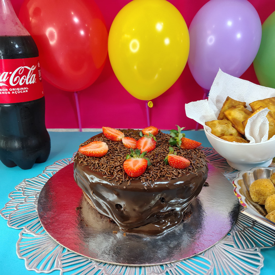 Esse kit festa é composto por 1 Bolo Vulcão de Chocolate com Morangos 1.200kg 6 Mini coxinhas de Frango (20g Cada) 6 Mini pastéis de Carne (20g Cada) 1 Coca-Cola de 1 Litro 4 Velinhas Estrelinha