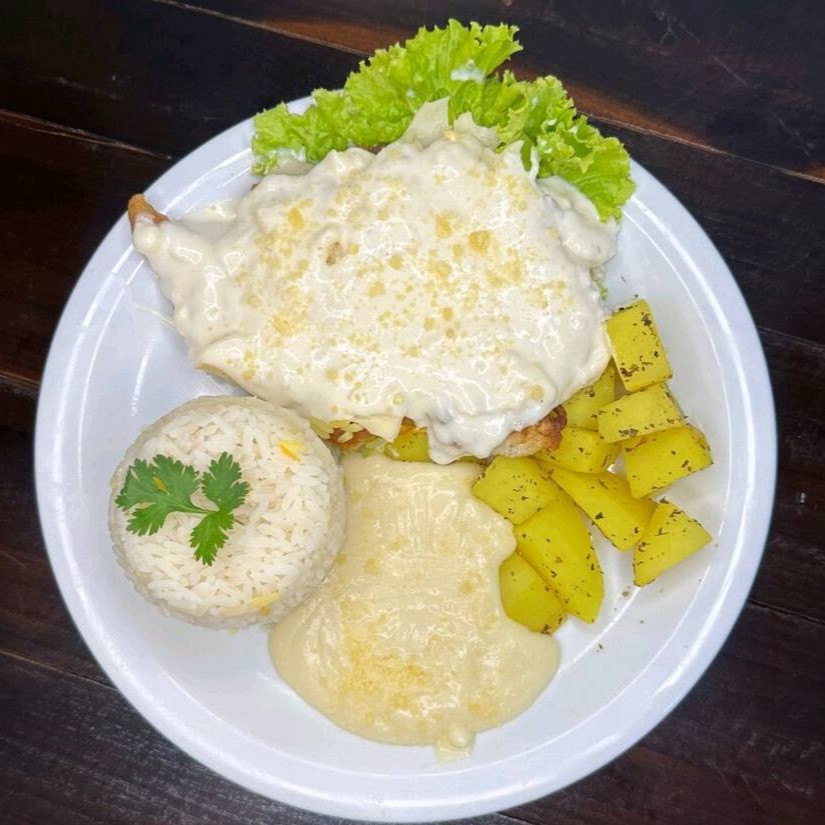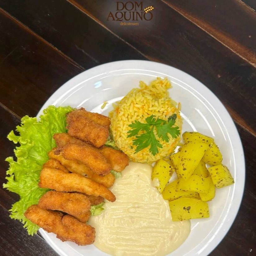 Tilápia empanado 160g, arroz branco 130g, purê 80g, batata souté, 80g.