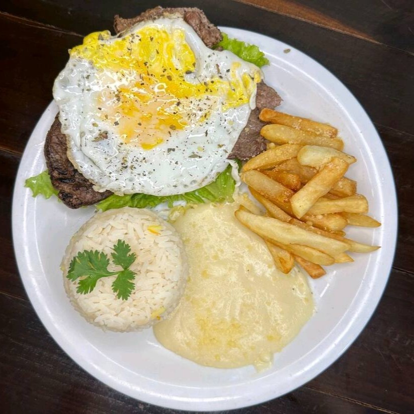 Bife bem suculento 160g, ovo 1, arroz branco 130g, purê 80g, batata frita 80g.