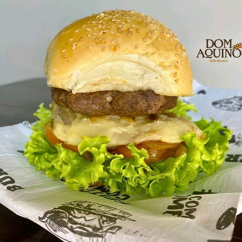 Pão bola com gergelim ou sem, bovino artesanal suculento 120g, queijo derretido, cebola caramelizada ou crua, tomate, alface, maionese caseira, catchup, e mostarda.