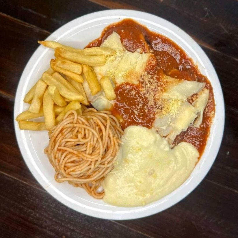 Parmegiana 160g, macarrão ao molho130g, Purê 80g, batata frita 80g..