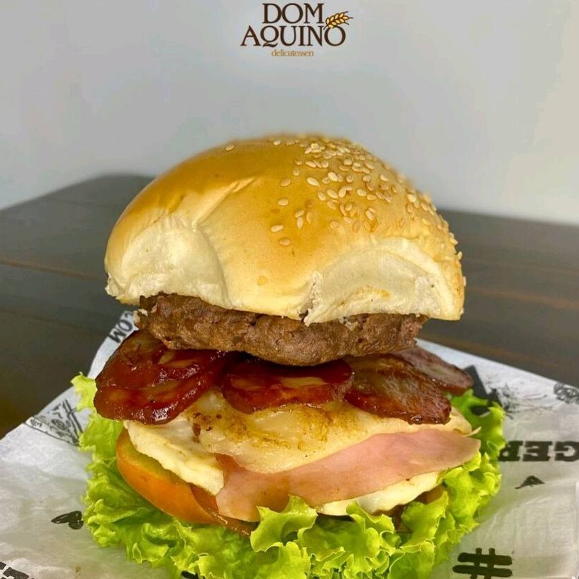 Pão bola com gergelim ou sem, bovino artesanal suculento 120g, bacon crocante, queijo derretido, ovo assado na manteiga,presunto, cebola caramelizada ou crua, tomate, alface, maionese caseira, catchup, e mostarda.