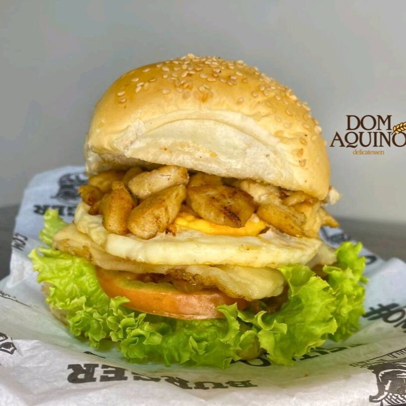 Pão bola com gergelim ou sem, frango em cubos saborosos 120g, queijo derretido, ovo assado na manteiga, cebola caramelizada ou crua, tomate, alface, maionese caseira, catchup, e mostarda.