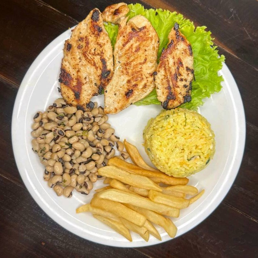 Frango grelhado no azeite 160g, feijão macassar 130g, arroz branco 130g, batata frita 80g .