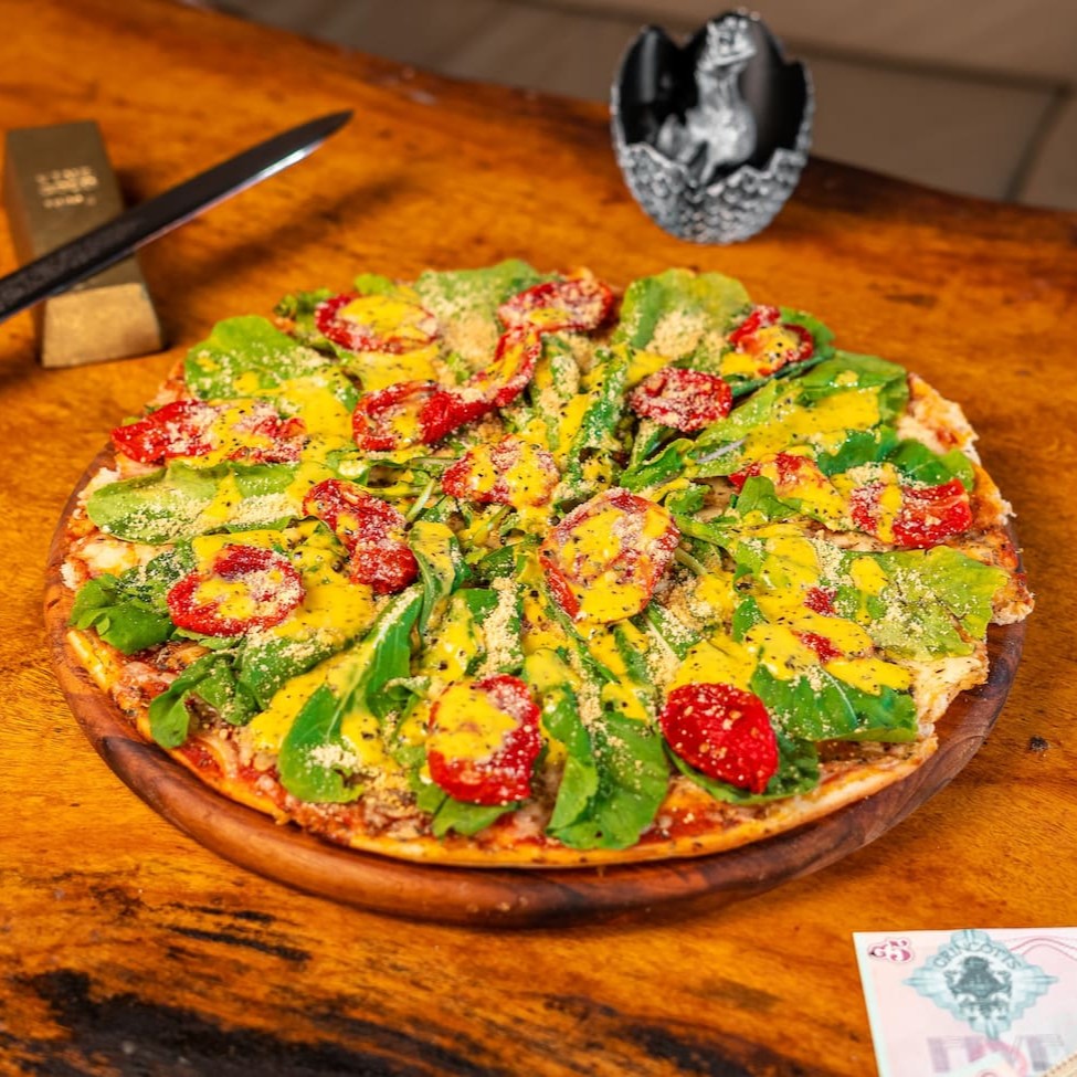 Massa artesanal fresca, molho de tomate caseiro, bastante queijo mussarela, uma porção generosa de bacon defumado, finalizado com geleia de pimenta biquinho (não arde). Atenção: Não trocamos, nem retiramos ingredientes.