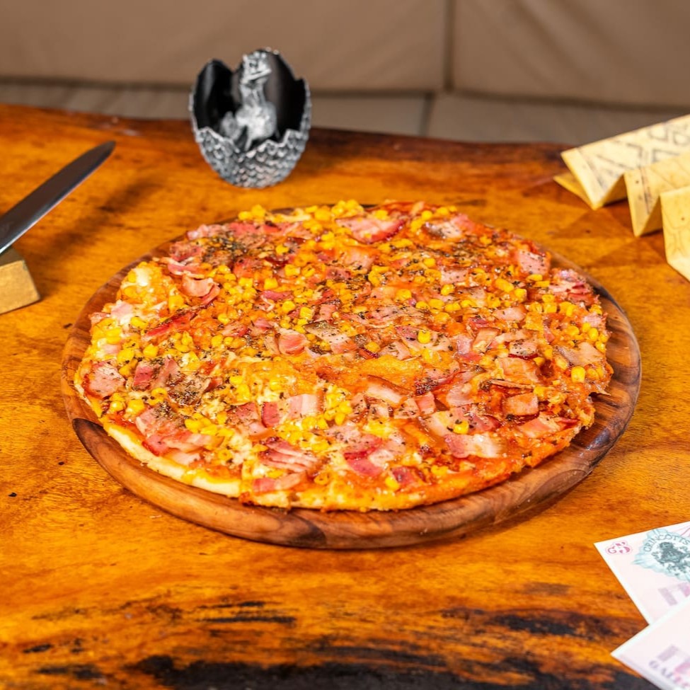 Massa artesanal fresca, molho de tomate caseiro, bastante queijo mussarela, uma porção generosa de bacon defumado, milho, finalizada com um leve toque de orégano. Atenção: Não trocamos, nem retiramos ingredientes.