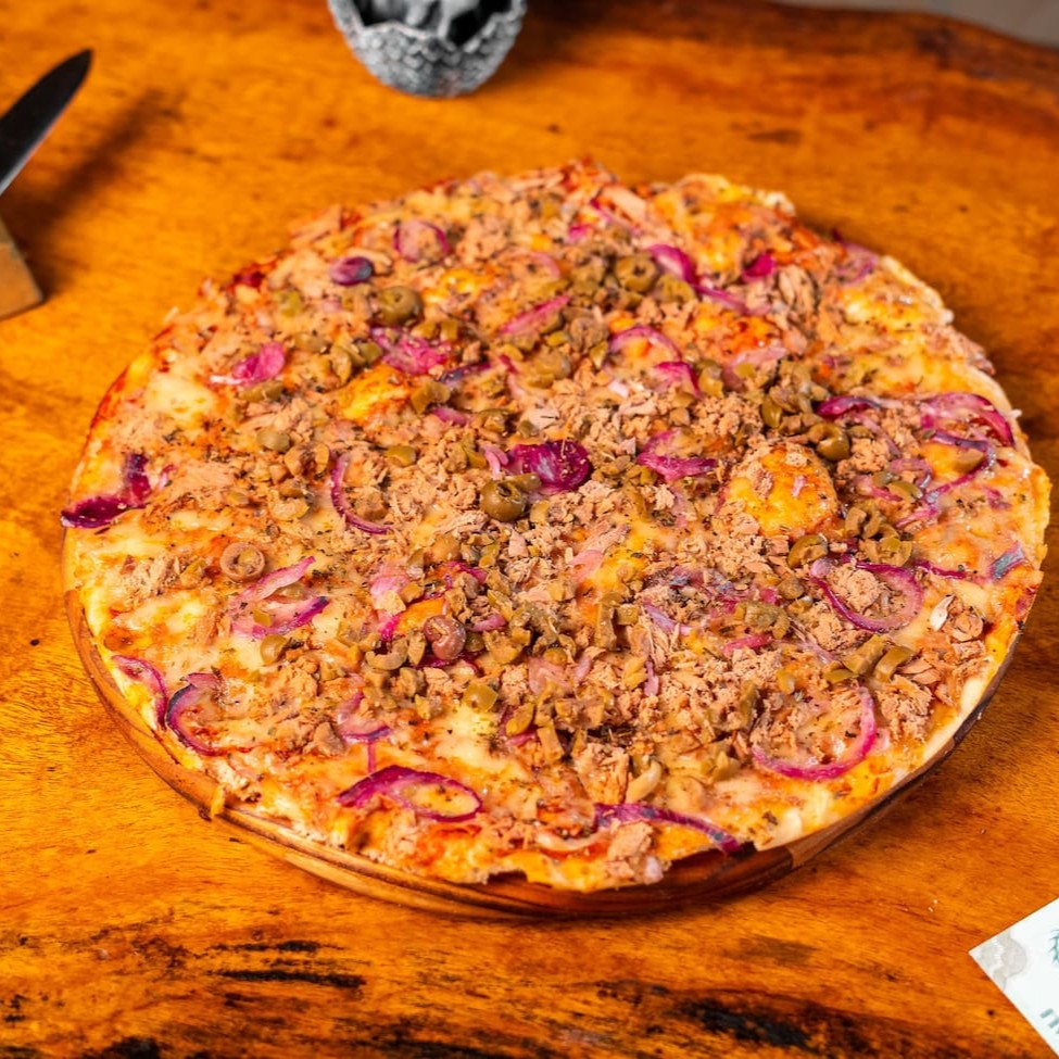 Massa artesanal fresca, molho de tomate caseiro, bastante queijo mussarela, porções generosas de atum e finalizado com cebola roxa, azeitona e um leve toque de orégano. Atenção: Não trocamos, nem retiramos ingredientes.