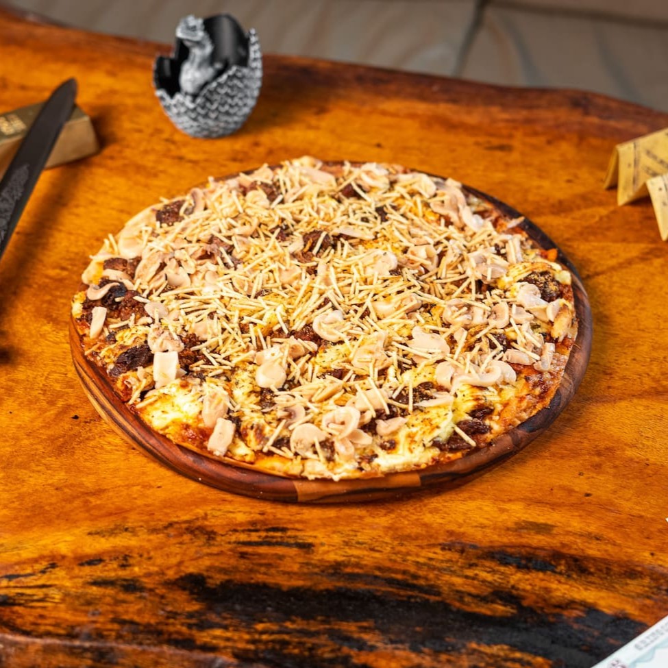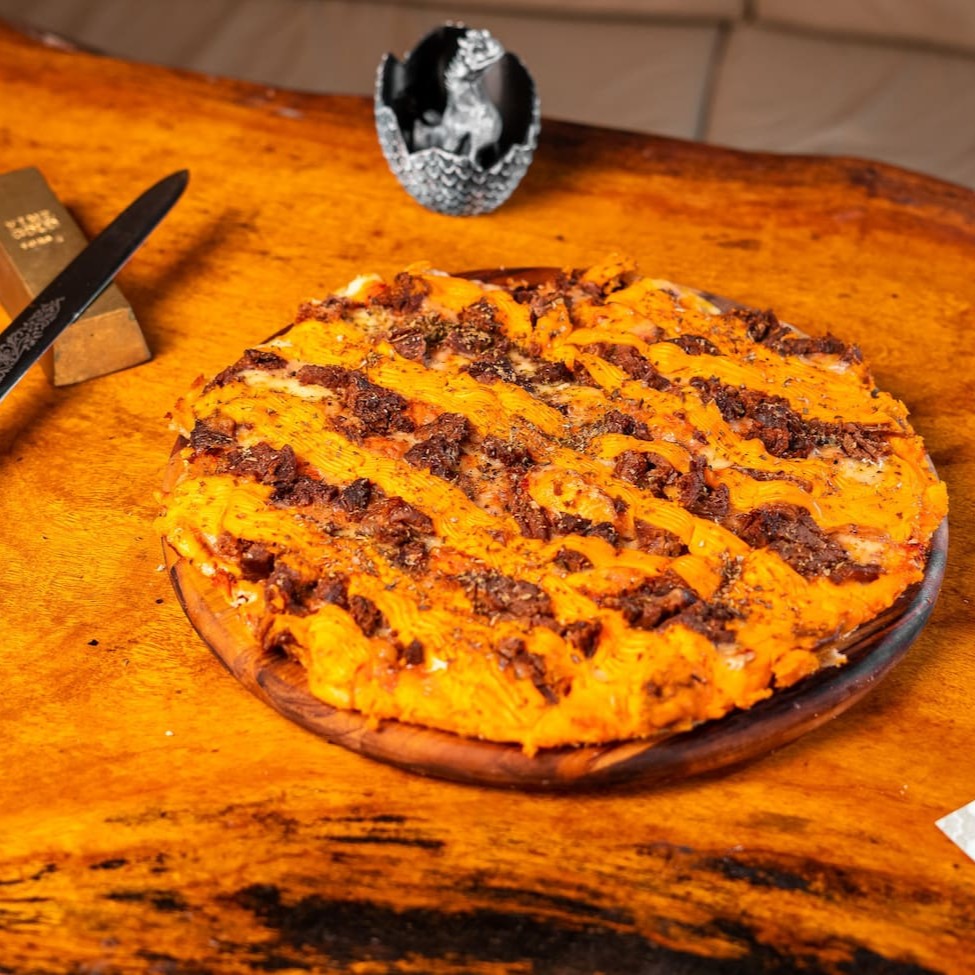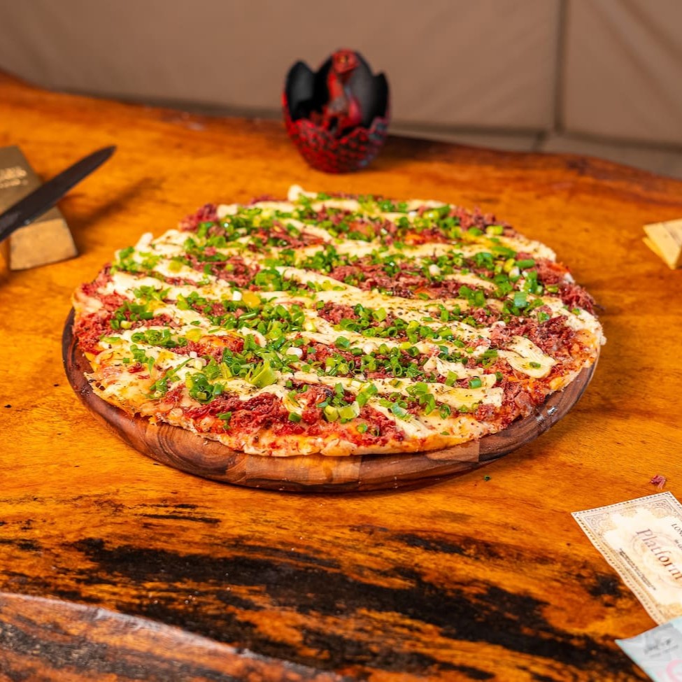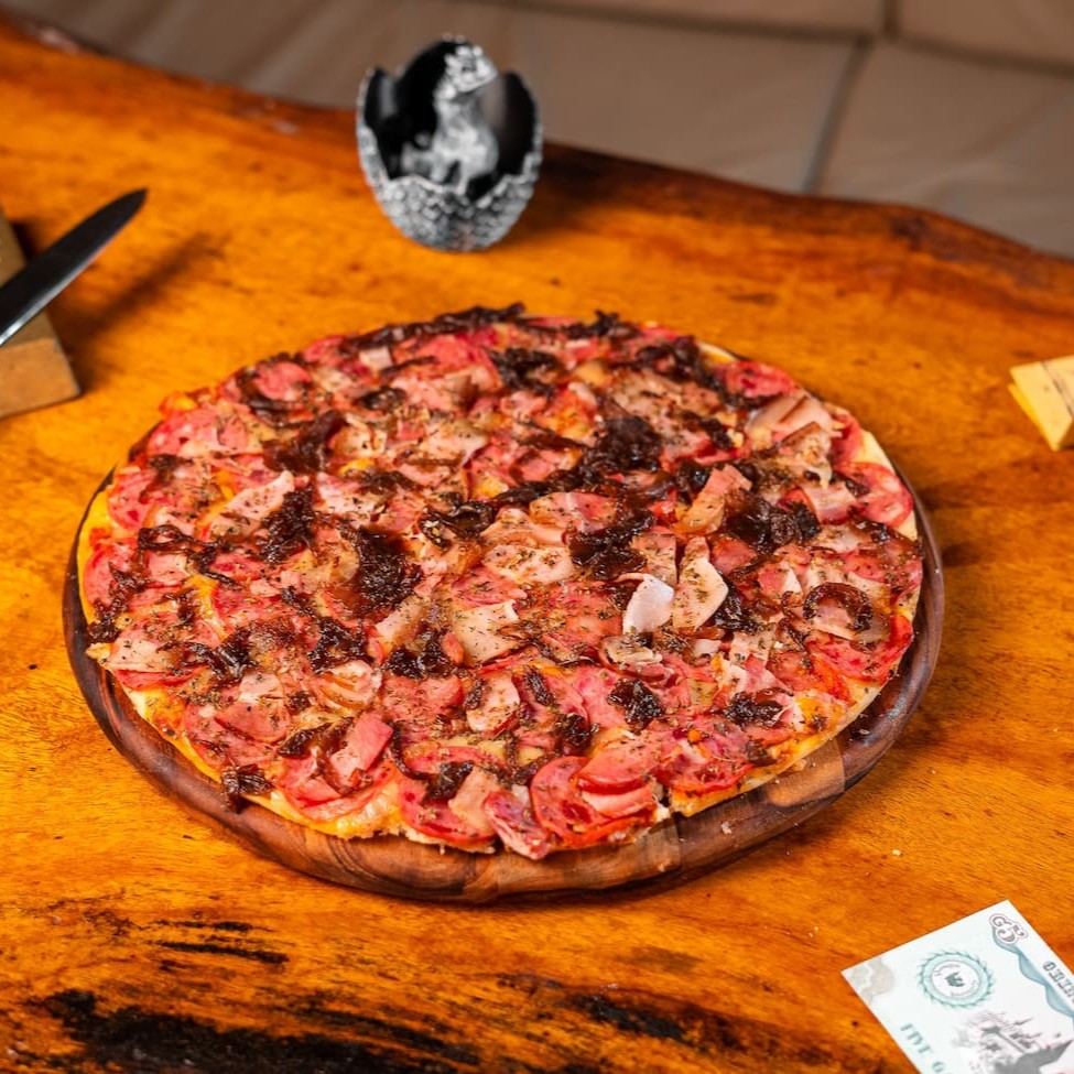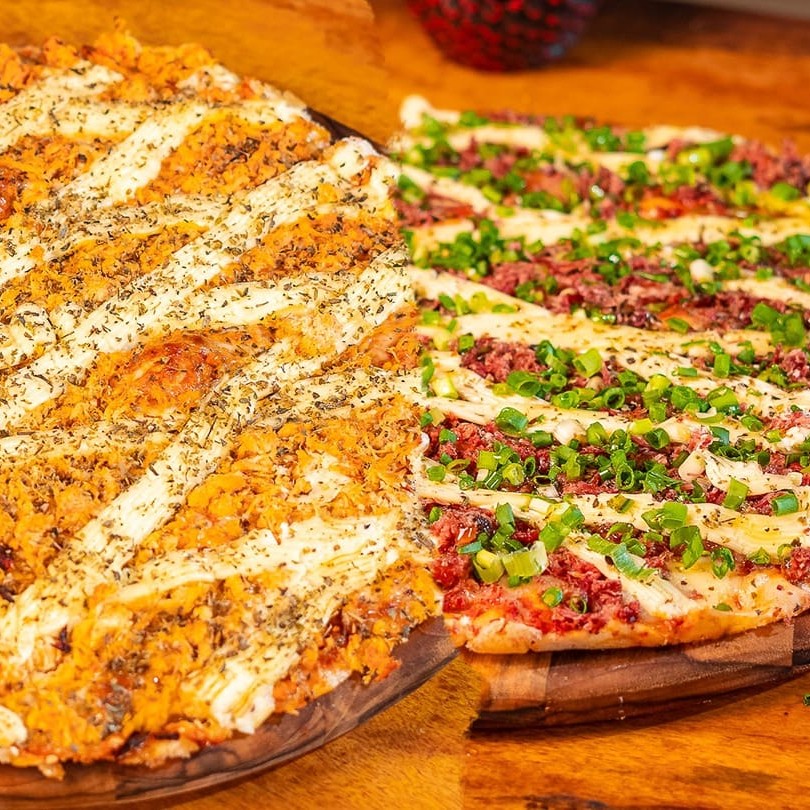 Massa artesanal fresca, molho de tomate caseiro, bastante queijo mussarela, uma porção generosa de charque de primeira, acompanhada de Catupiry Original, finalizada com cebolinho e um leve toque de orégano. Atenção: Não trocamos, nem retiramos ingredientes.