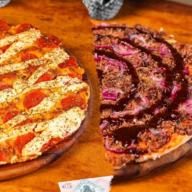 Pepperoni com Cream Cheese: massa artesanal fresca, molho de tomate caseiro, bastante queijo mussarela, uma porção generosa de pepperoni, acompanhado de cream cheese Original e finalizado com um leve toque de orégano. Costela com Barbecue: massa artesanal fresca, molho de tomate caseiro, bastante queijo mussarela, uma porção generosa de costela bovina desfiada no bafo, finalizada com cebola roxa, barbecue e um leve toque de orégano. Atenção: Não trocamos, nem retiramos ingredientes.