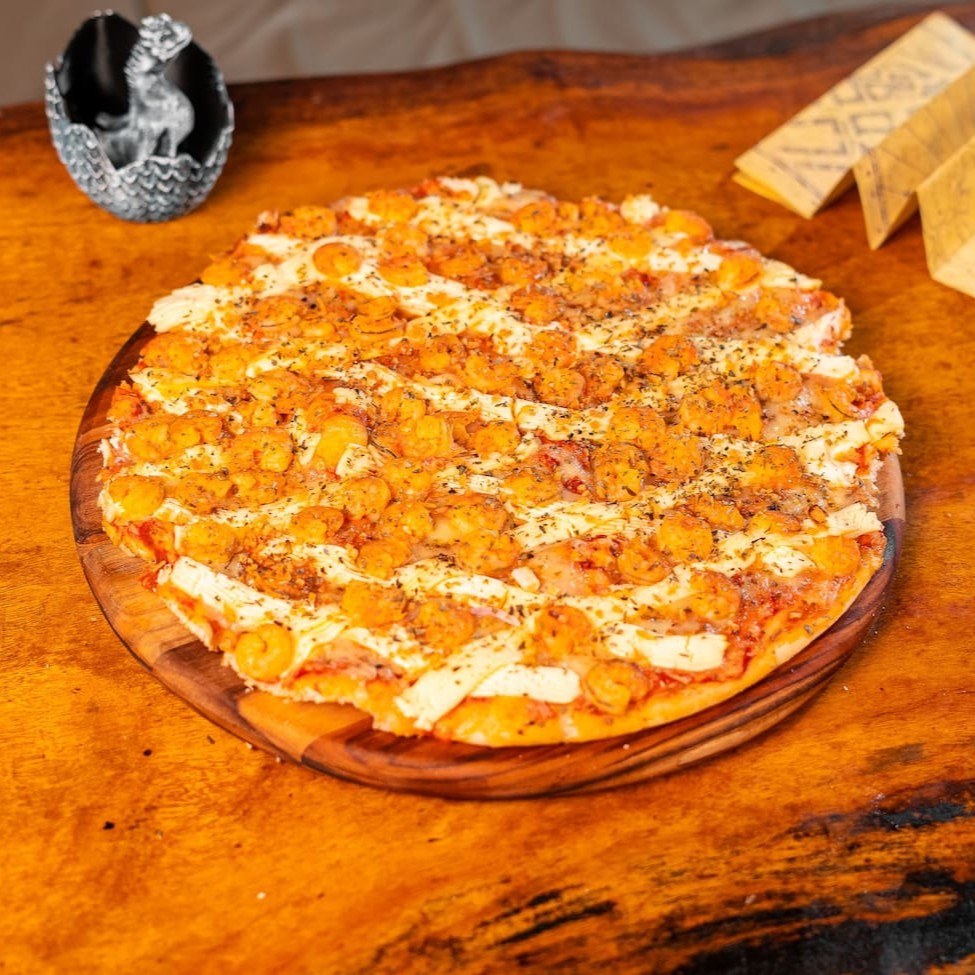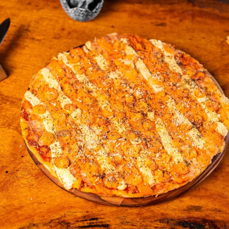 Massa artesanal fresca, molho de tomate caseiro, bastante queijo mussarela, uma porção generosa de filé de camarão, acompanhado com Catupiry Original e finalizada com alho crocante (frito). Atenção: Não trocamos, nem retiramos ingredientes.