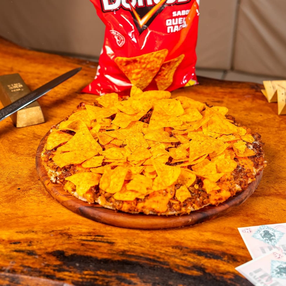 Massa artesanal fresca, molho de tomate caseiro, bastante queijo mussarela, uma porção generosa de carne de primeira triturada, cheddar Original, servida com Doritos à parte para você finalizar. Atenção: Não trocamos, nem retiramos ingredientes.