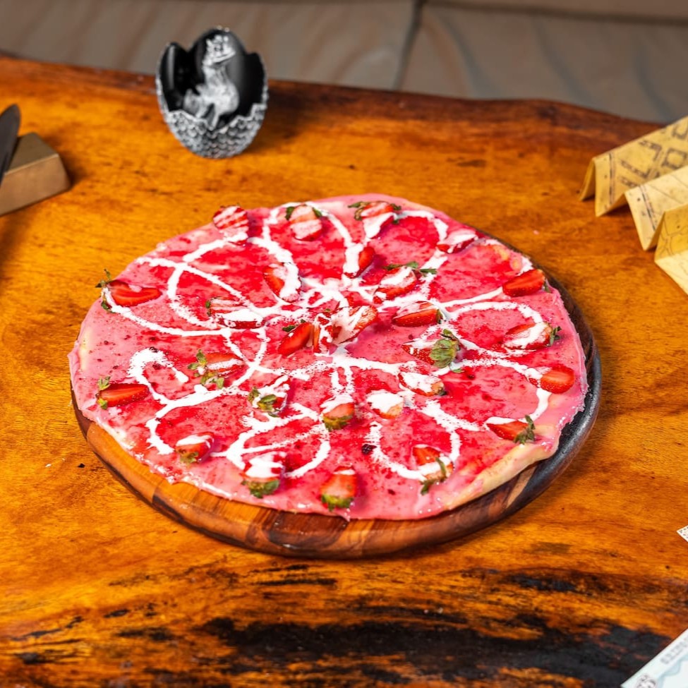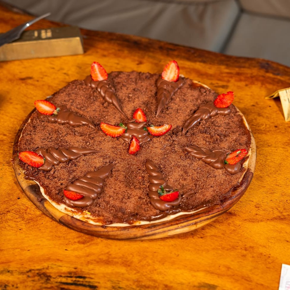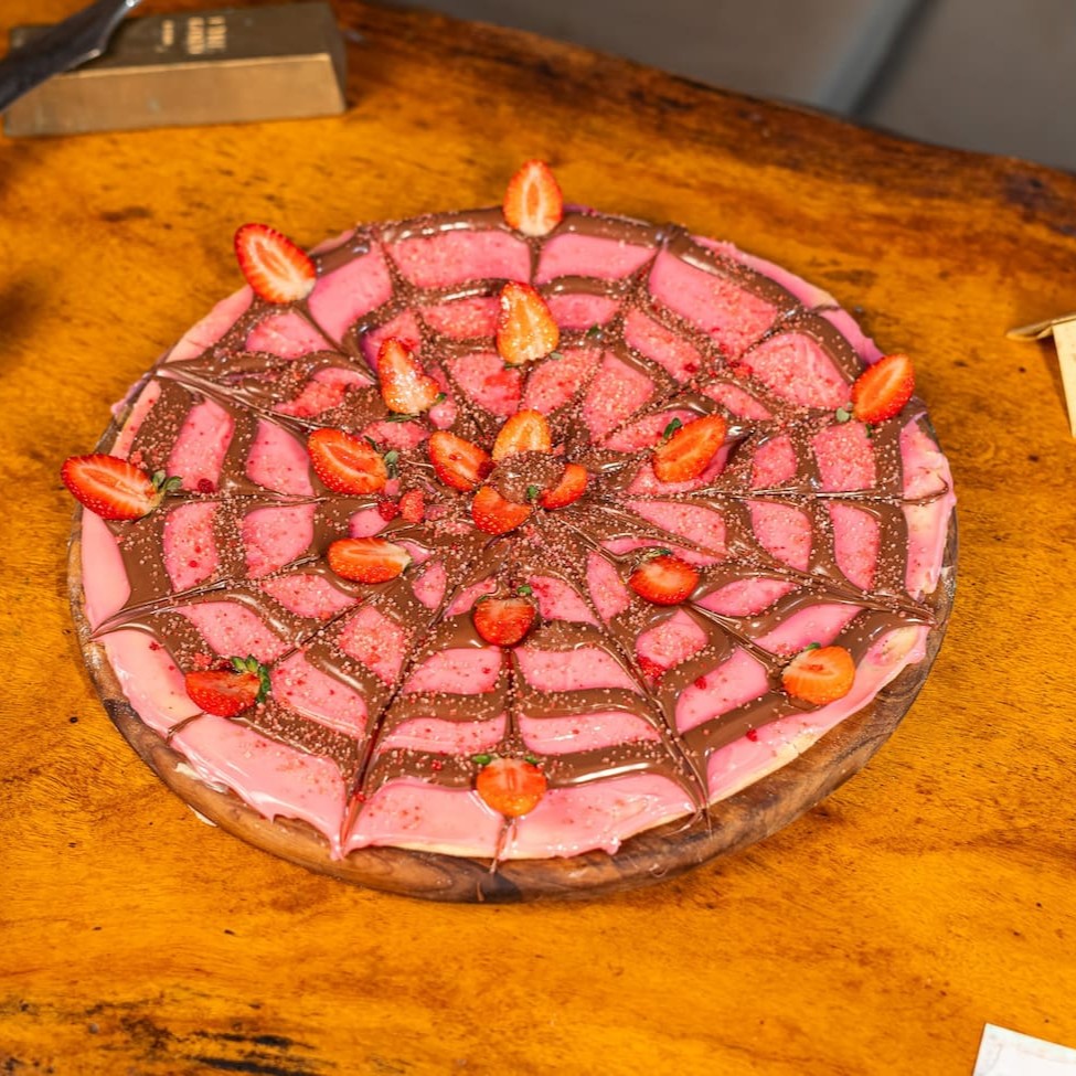 Massa artesanal fresca, base Nestlé no sabor morango, chocolate preto, finalizado com morangos frescos e açúcar cristalizado rosa. Atenção: Não trocamos, nem retiramos ingredientes.