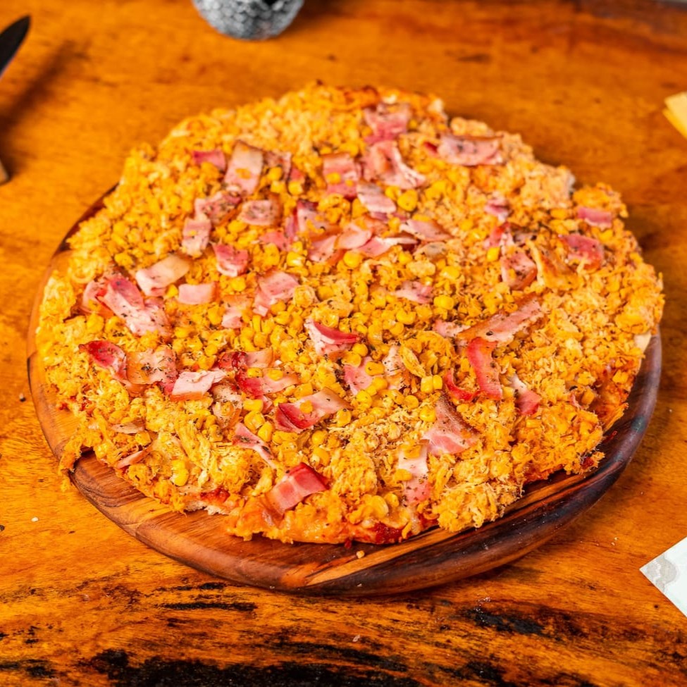 Massa artesanal fresca, molho de tomate caseiro, bastante queijo mussarela, uma porção generosa de frango, bacon defumado, milho e finalizada com um leve toque de orégano. Atenção: Não trocamos, nem retiramos ingredientes.