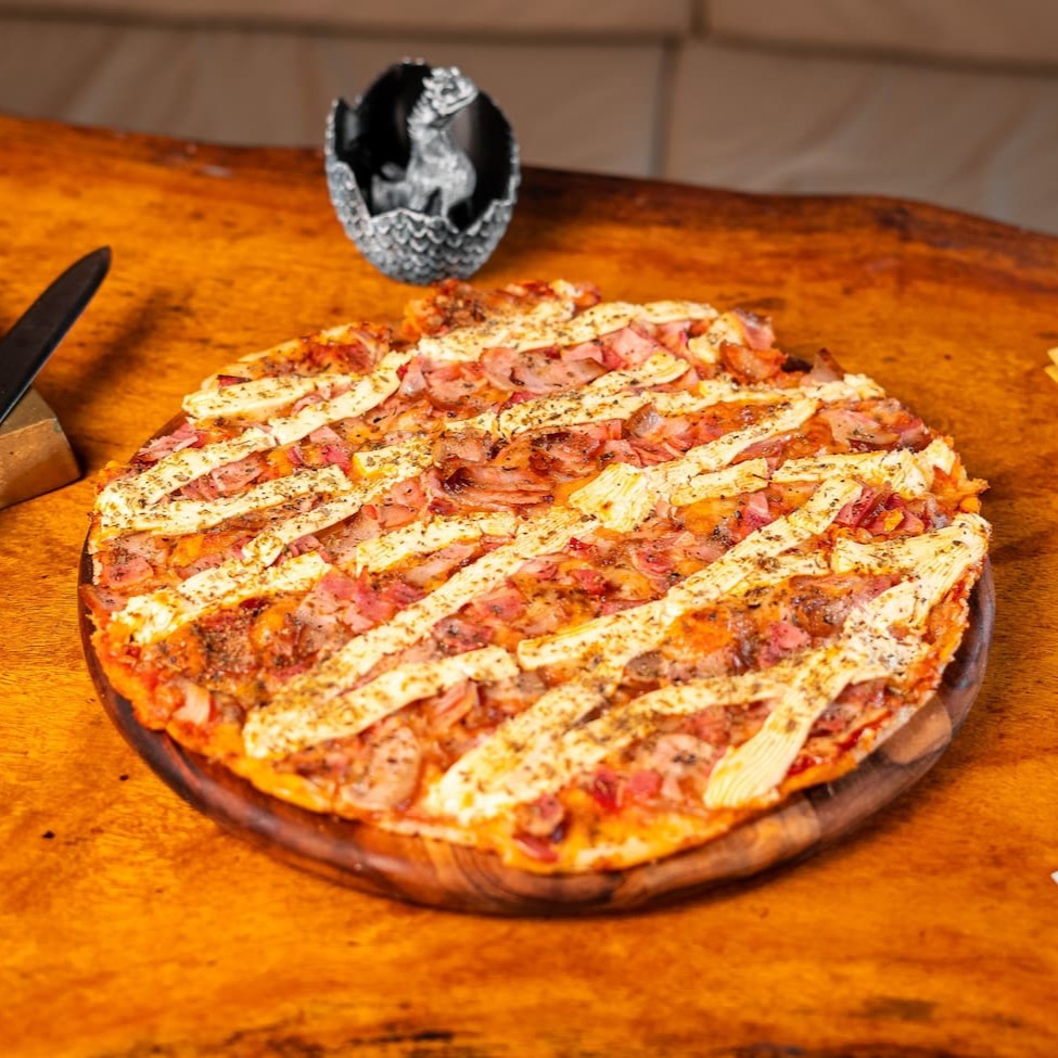 Massa artesanal fresca, molho de tomate caseiro, bastante queijo mussarela, uma porção generosa de bacon defumado, acompanhada de calabresa e cebola caramelizada e finalizada com um leve toque de orégano. Atenção: Não trocamos, nem retiramos ingredientes.