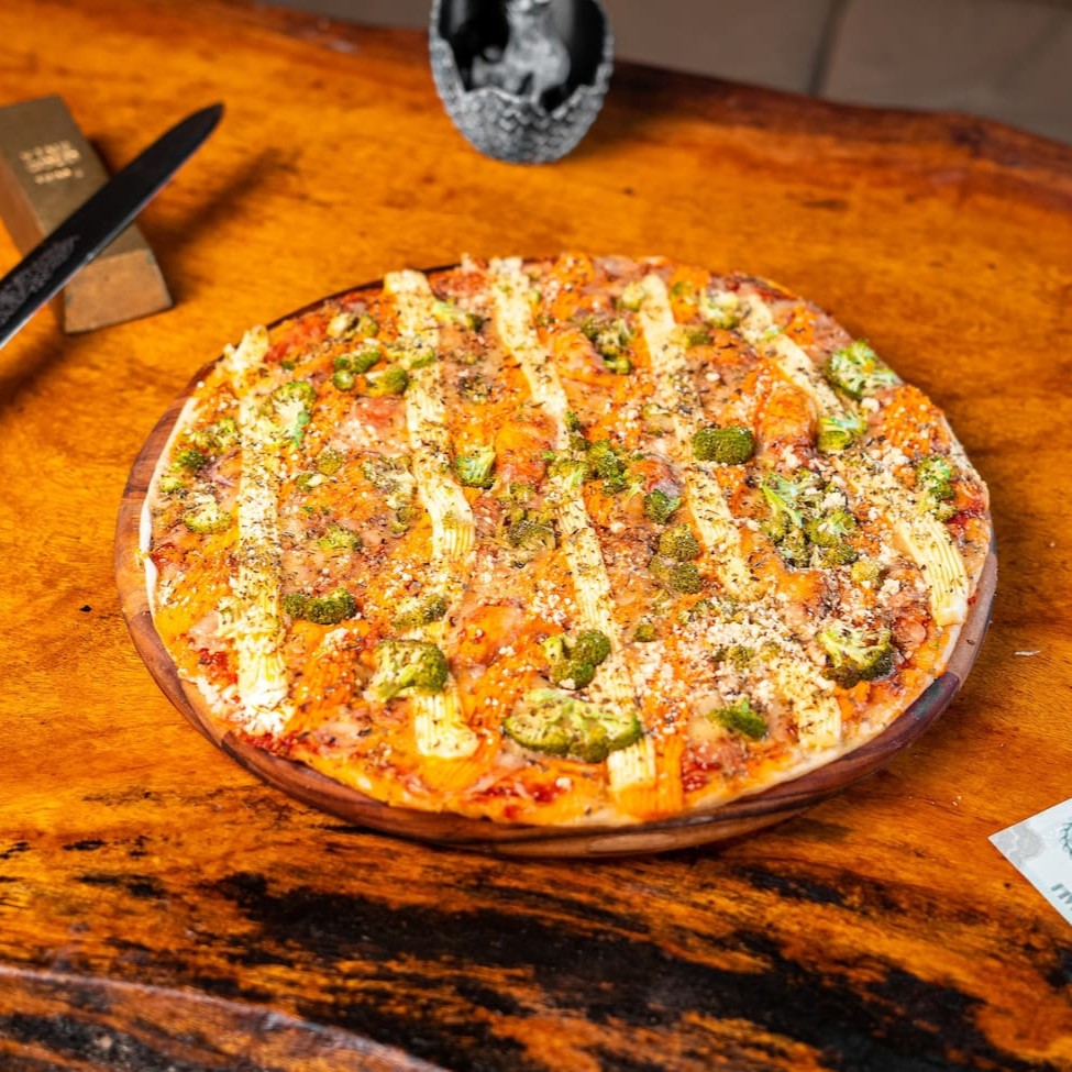 Massa artesanal fresca, molho de tomate caseiro, bastante queijo mussarela, porções generosas de Catupiry Original, cheddar Original e parmesão ralado, finalizado com brócolis e um leve toque de orégano. Atenção: Não trocamos, nem retiramos ingredientes.