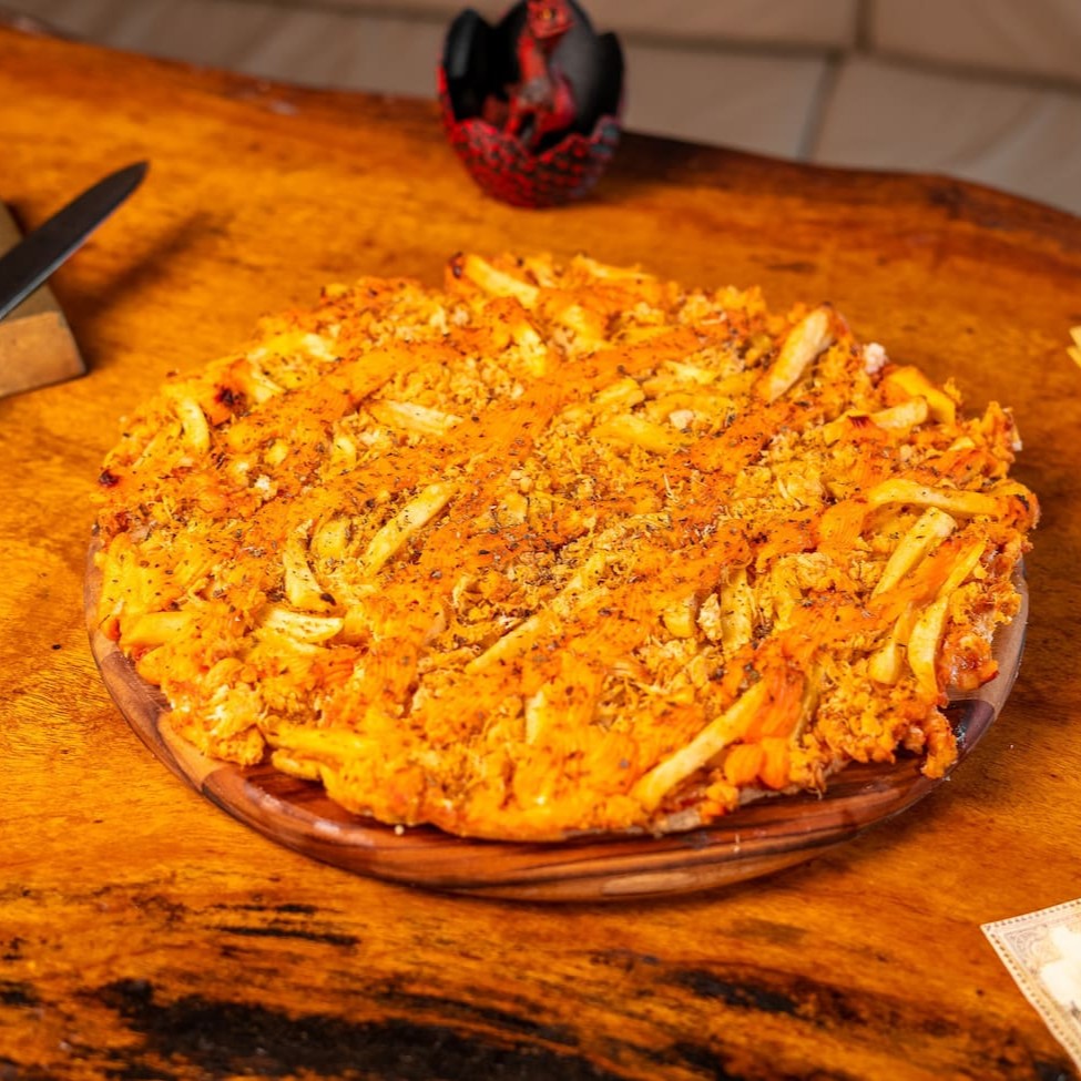Massa artesanal fresca, molho de tomate caseiro, bastante queijo mussarela, uma porção generosa de frango, acompanhada de cheddar Original, batata frita, finalizada com um leve toque de orégano. Atenção: Não trocamos, nem retiramos ingredientes.