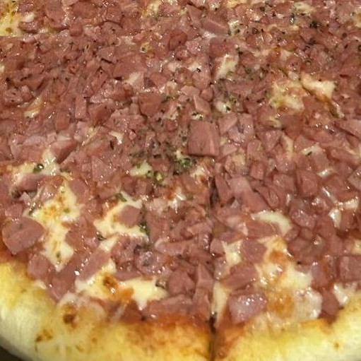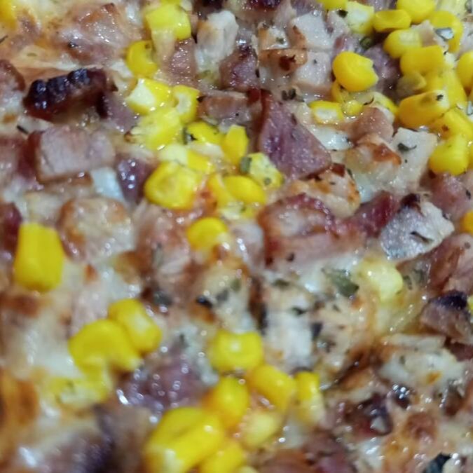 Massa tradicional, molho de tomate da casa, queijo mussarela, milho, bacon torradinho em cubos, azeitona e orégano.