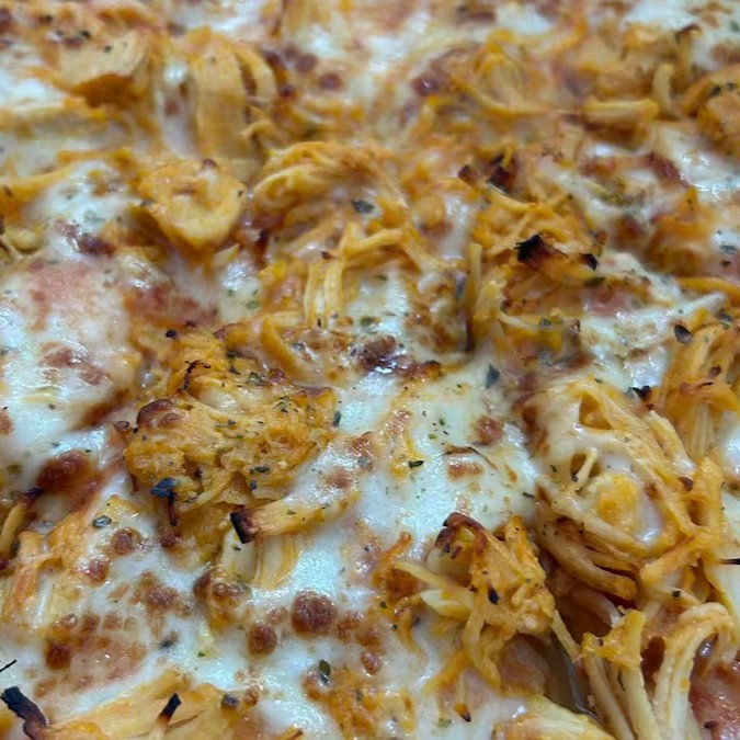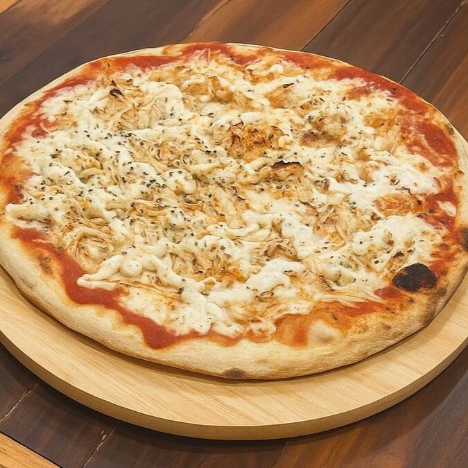 Massa tradicional, molho de tomate da casa, queijo mussarela, frango, milho e orégano.