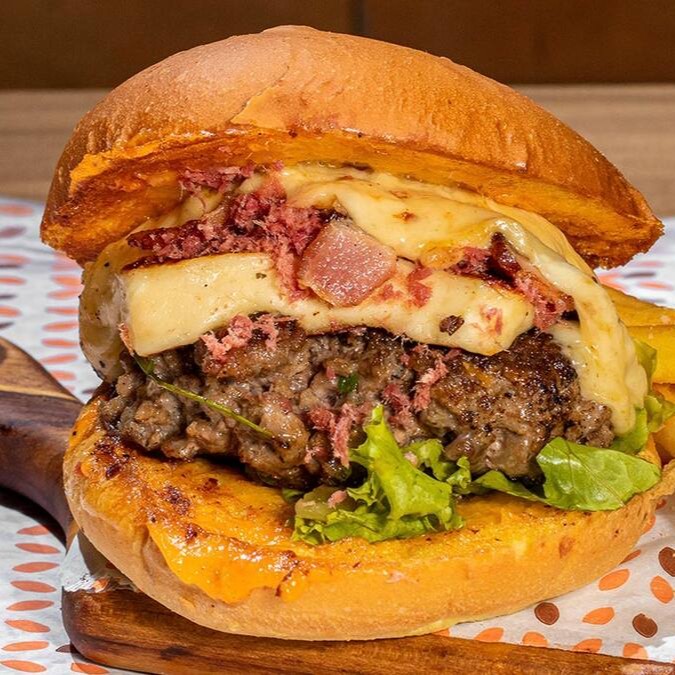 Burguer bem temperado e artesanal, pão amanteigado celado no cheedar, queijo mussarela, bacon, carne de sol fatiada, salada, batata frita e molho a sua escolha.