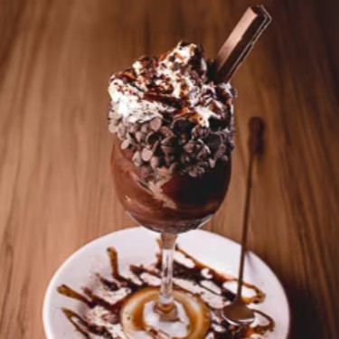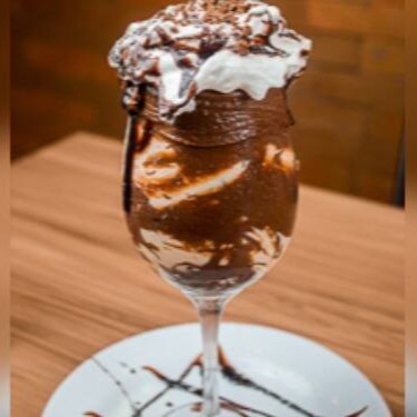 Sorvete de chocolate cremoso, kitkat, gotas de chocolate, creme de avelã especial, chantilly, cobertura de chocolate e Ovomaltine