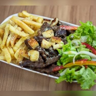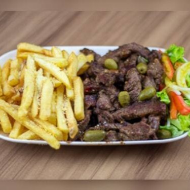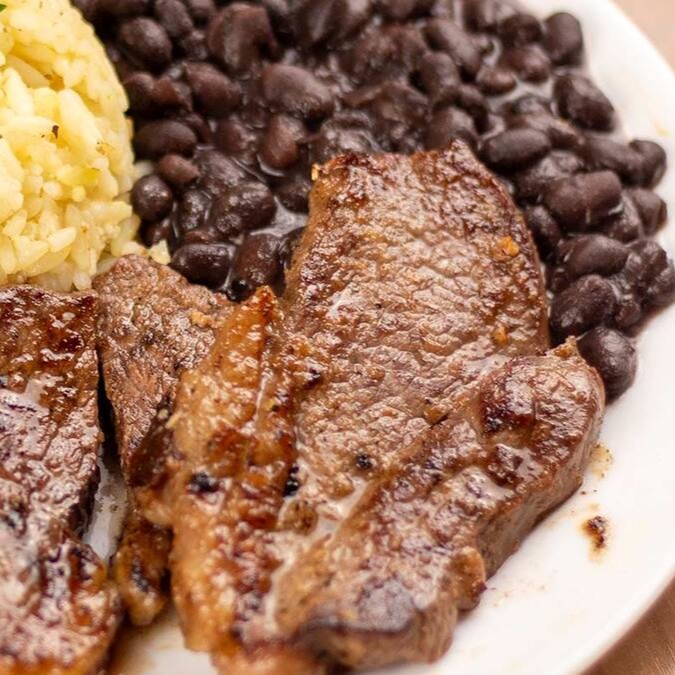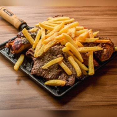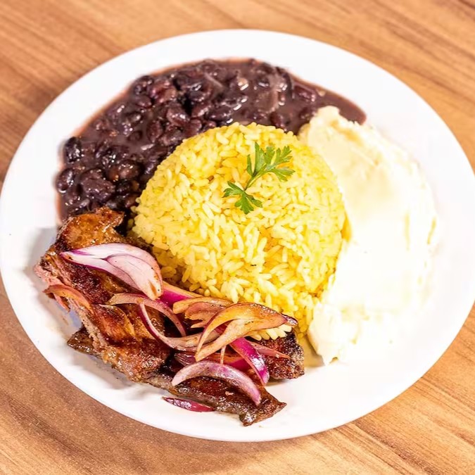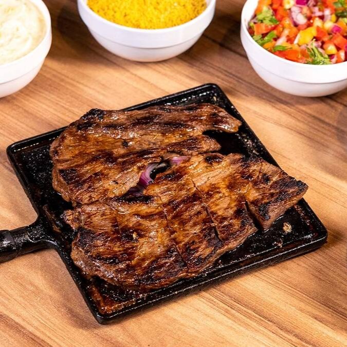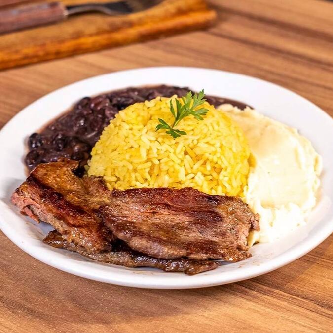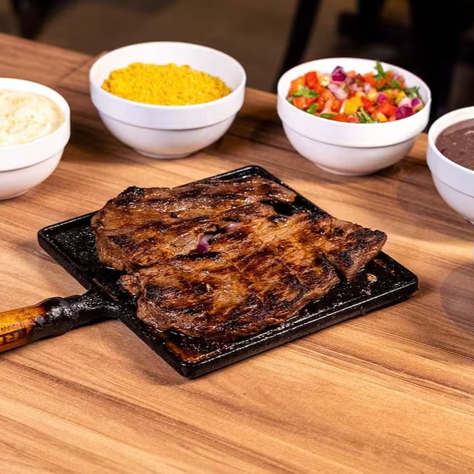 Bife na parrilha, cebola na chapa, Arroz temperado com açafrão e Chimichurri ou arroz de brócolis, feijão preto (não contém nada de origem suina) ou macassar, batata frita ou purê de batata.