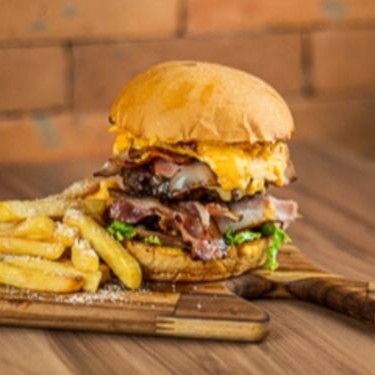 Burguer bem temperado e artesanal, pão amanteigado selado com cheddar, queijo mussarela, bacon, costela no bafo fatiada e molinha, cebola caramelizada, salada, batata frita e molho a sua escolha.