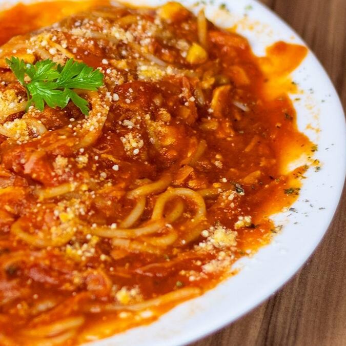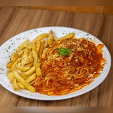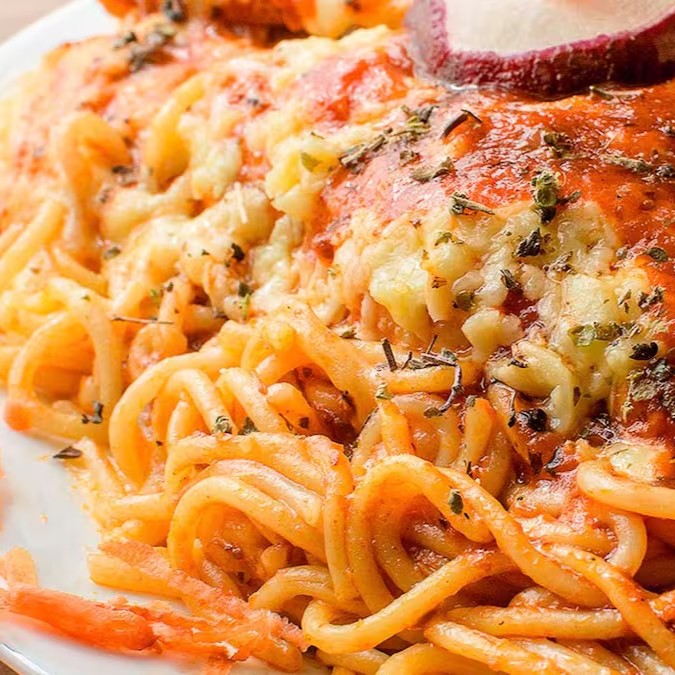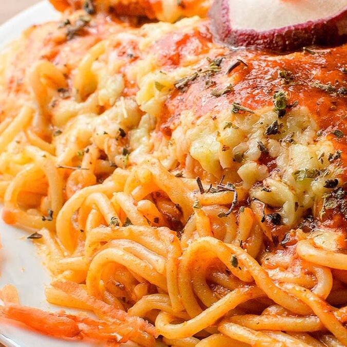 Espaguete ao molho de tomate gratinado e exclusivo, acompanhado com batata frita ou purê de batata.