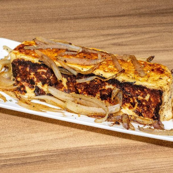 Queijo coalho derretido na manteiga, generoso e saboroso, acompanhado com cebola refogada na chapa.