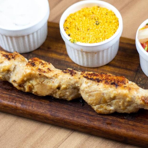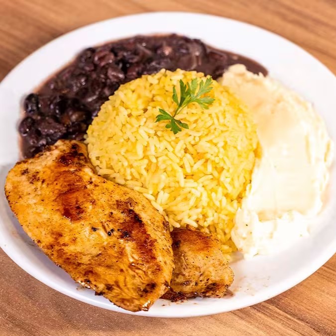 Filé de frango com tempero especial acompanhado com arroz temperado com açafrão e chimichurri ou arroz de brócolis, feijão preto (não contém nada de origem suína) ou macassar, batata frita ou purê de batata.