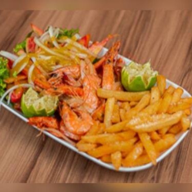 Camarão acompanhado com batata fritas.