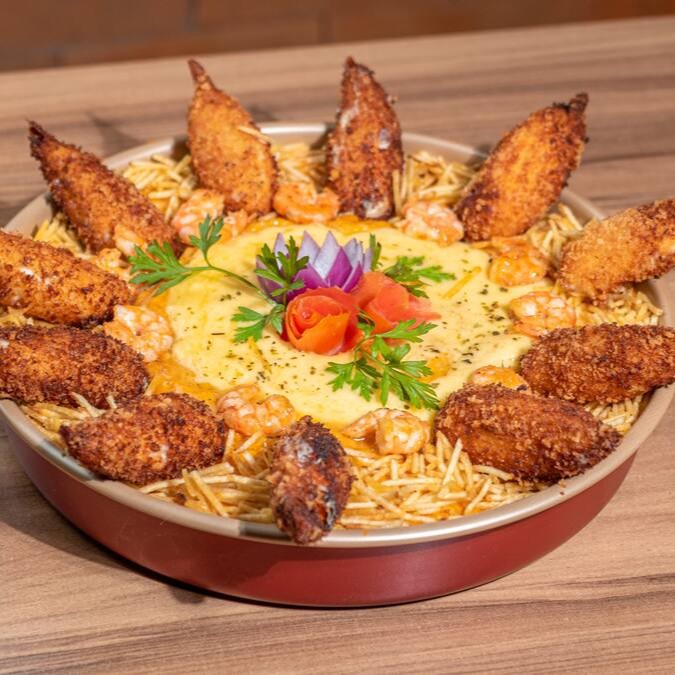 Camarão empanado na massa de pastel ao Creme Cheese, Arroz cremoso com tempero exclusivo do chefe, filé de camarão refogado e batata palha. Serve até 4 pessoas.