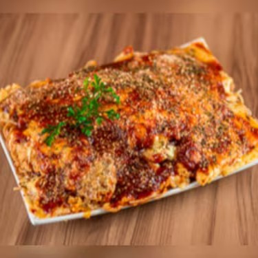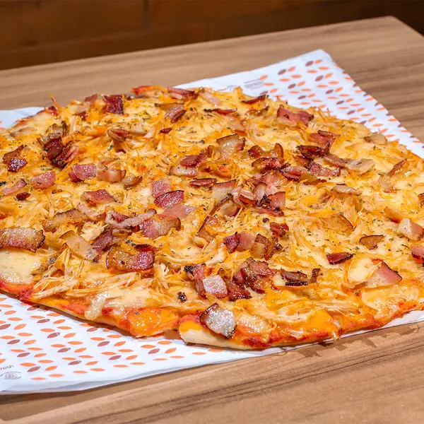 Molho de tomate gratinado e exclusivo, queijo mussarela, frango desfiado e bacon triturado.