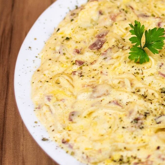 Spaghetti refogado na manteiga ao molho branco, calabresa triturada, bacon triturado, acompanhado com purê de batata.