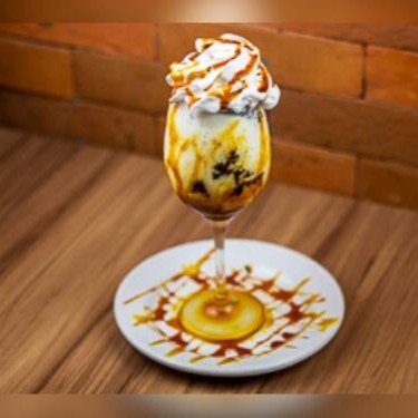 Sorvete de creme, pedaços de brownie, caramelo derretido e creme de avelã especial