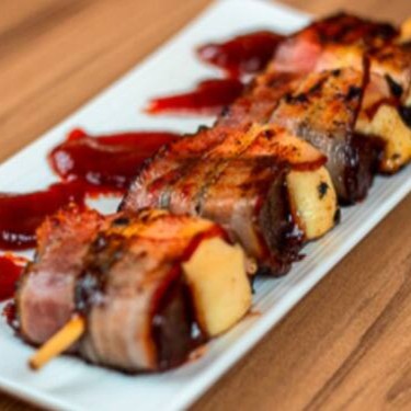 Queijo coalho temperado e goiabada envolvido no bacon.
