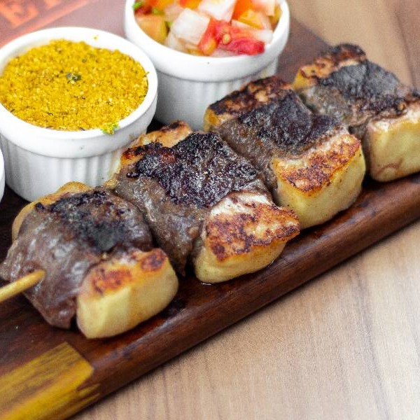 Queijo coalho na manteiga, envolvido na carne de sol matuta, tempero especial, acompanhado com salada, farofa e molho a sua escolha.