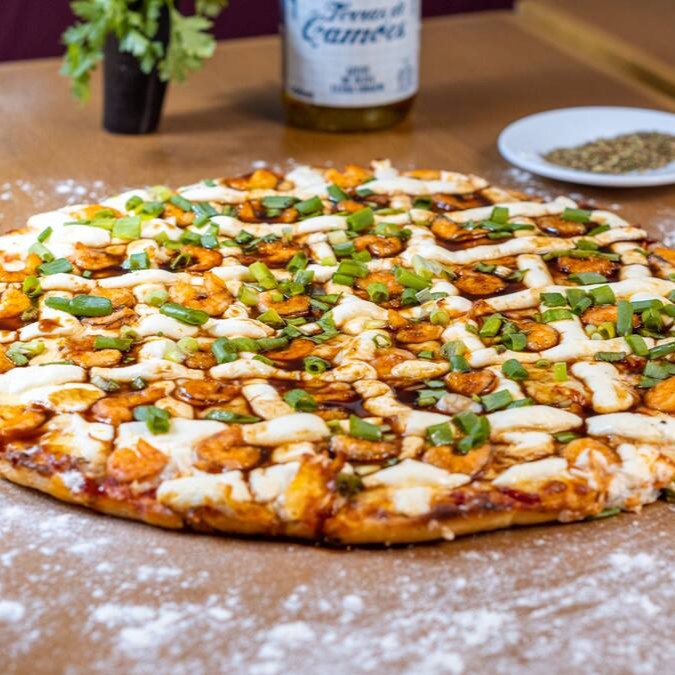 Molho de tomate, mussarela, filé de camarão fresco (250g) em pedaços, cream cheese, cebolinho e molho teriyaki feito na casa.