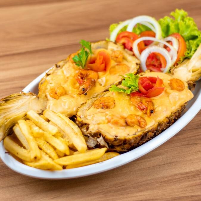 Arroz cremoso, abacaxi, 300g de camarão, batata frita e o toque especial do chefe.