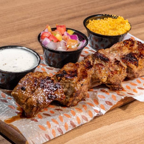 Bife Suculento, Costela, Cupim, Toscana e Galeto com tempero exclusivo, acompanhado de arroz temperado com açafrão e chimichurri ou arroz de brócolis, feijão preto (não contém nada de origem suína) ou macassar, farofa, vinagrete, batata frita e purê de batata.