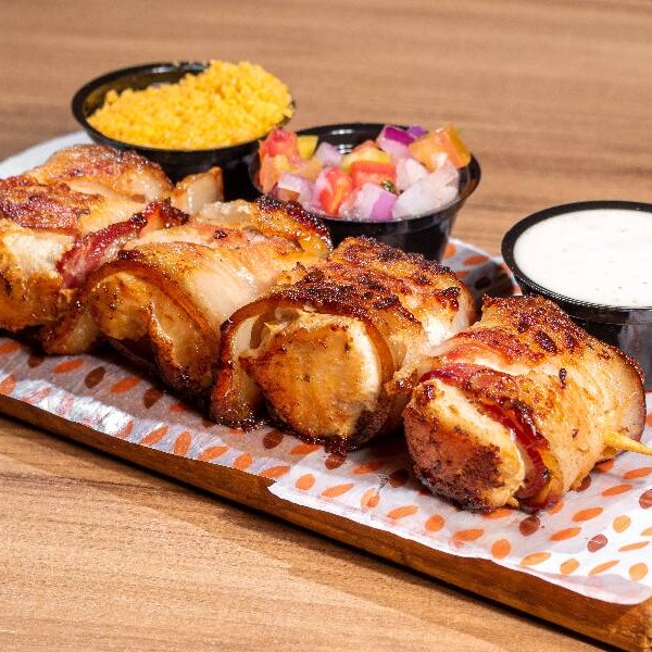 Filé de frango temperado envolvido no bacon, acompanhado com salada, farofa e molho a sua escolha.