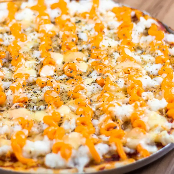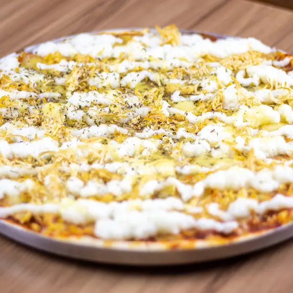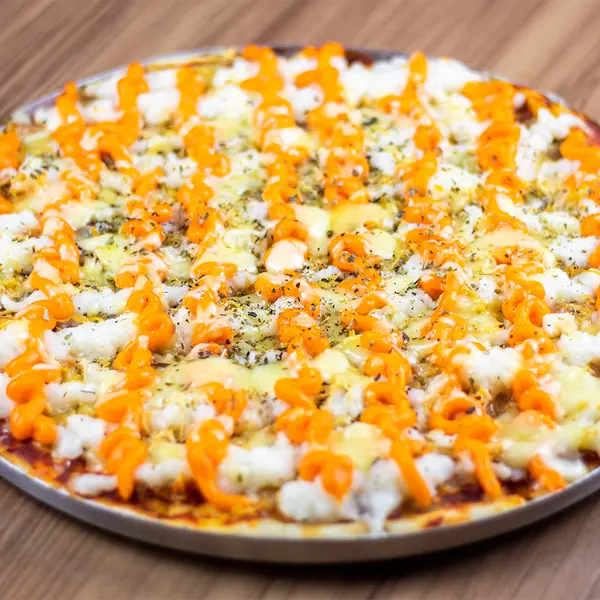 Molho de tomate gratinado e exclusivo, queijo mussarela, frango desfiado temperado e requeijão.