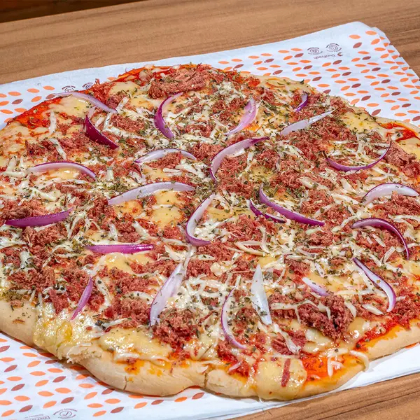 Molho de tomate gratinado e exclusivo, queijo mussarela, charque desfiada, queijo coalho e cebola.