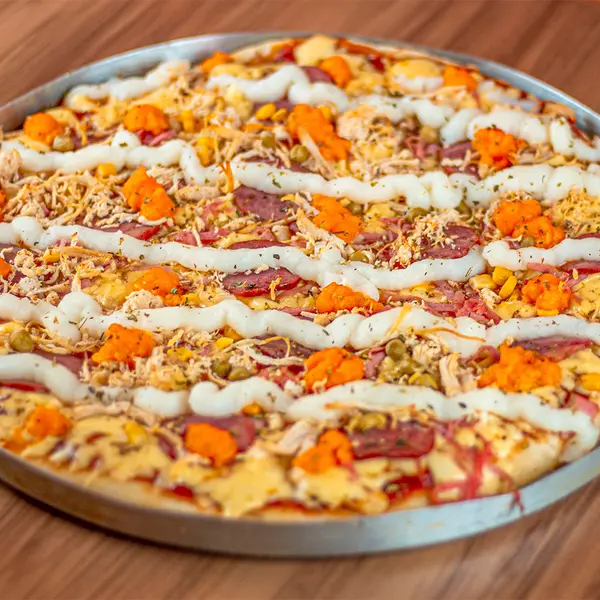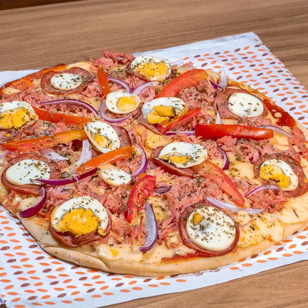 Molho de tomate gratinado e exclusivo, queijo mussarela, presunto, calabresa, ovo cozido, cebola e tomate.