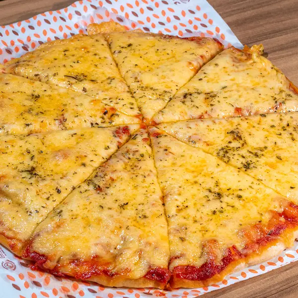 Molho de tomate gratinado e exclusivo, queijo mussarela, queijo cheddar e requeijão.