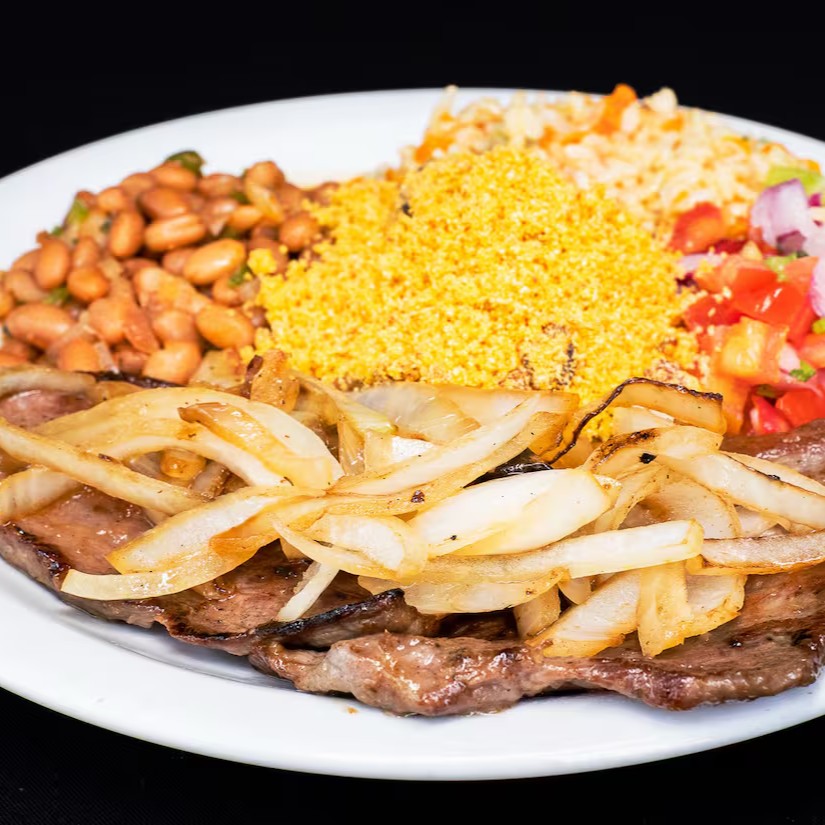 Filé de carne macia e extremamente acebolada com manteiga de garrafa na chapa + 4 acompanhamentos à sua escolha.