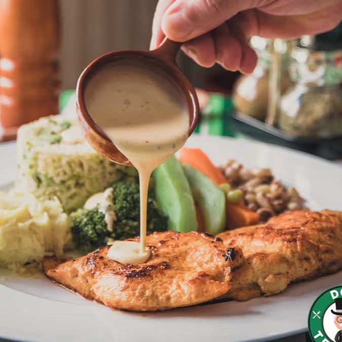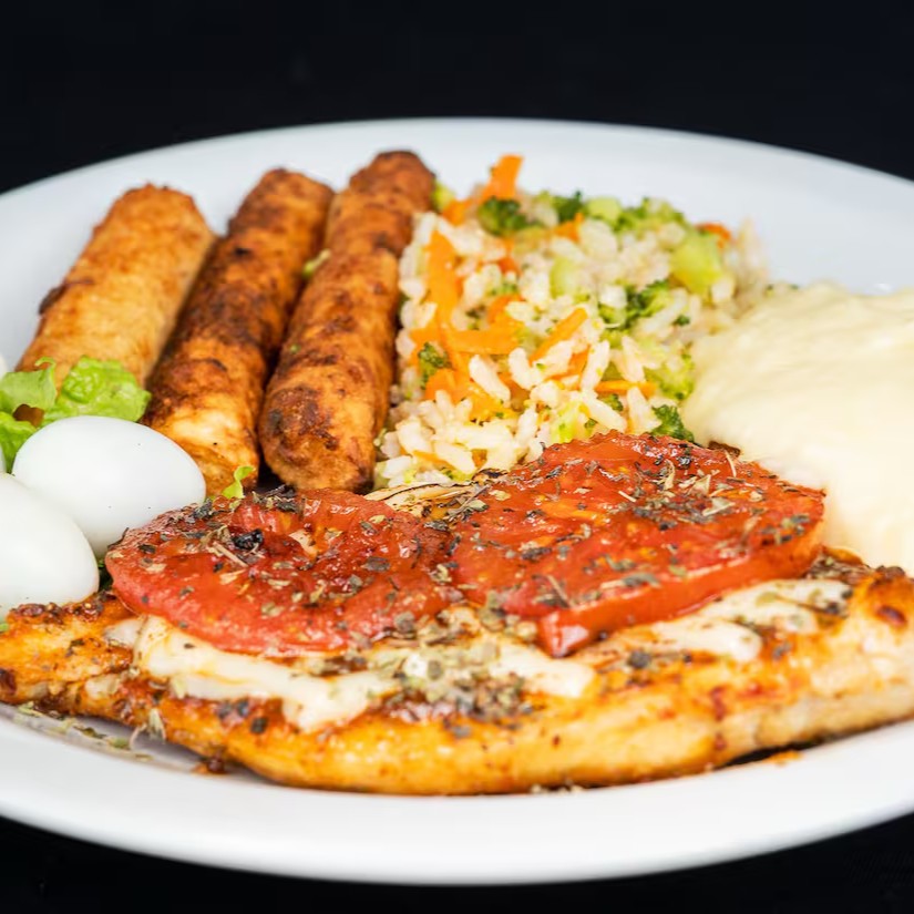 Generoso filé de peito de frango grelhado e muito bem temperado na chapa com azeite de ervas da casa + 4 acompanhamentos à sua escolha.