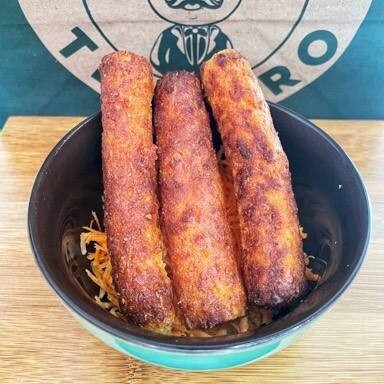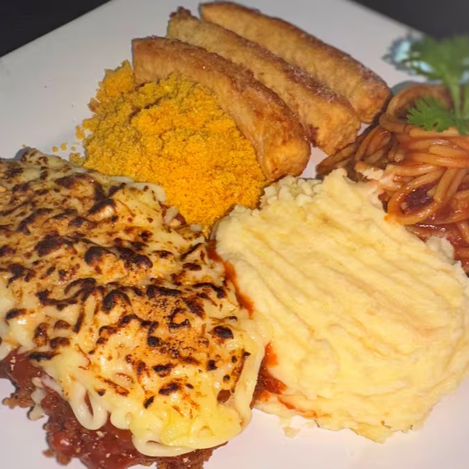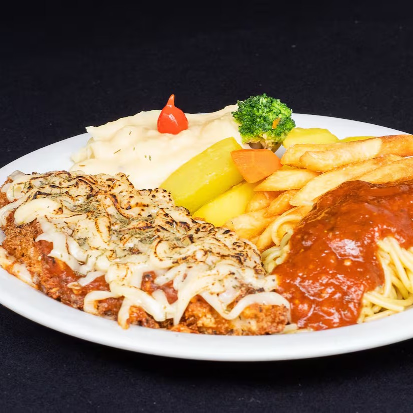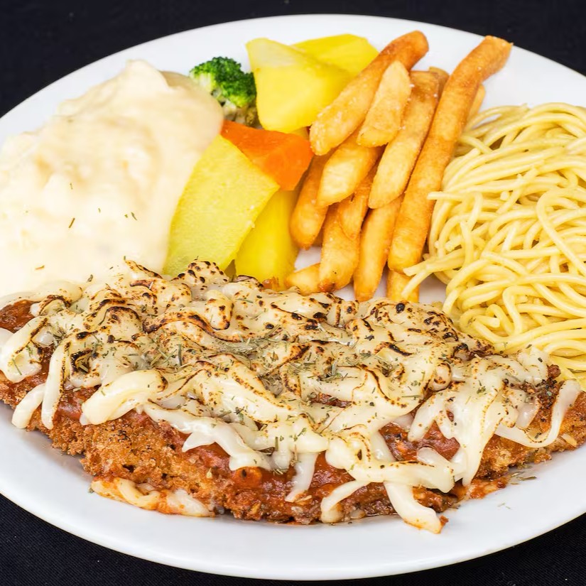 Filé de carne à Parmegiana extremamente crocante e suculento, coberto com delicioso molho pomodoro artesanal e queijo muçarela maçaricado + 4 acompanhamentos à sua escolha.