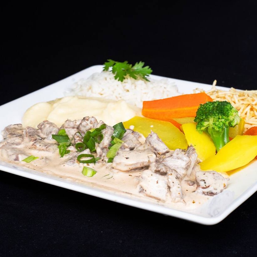 Cubos macios de filé de carne com molho tradicional e toque especial do Cheff + 4 acompanhamentos à sua escolha.